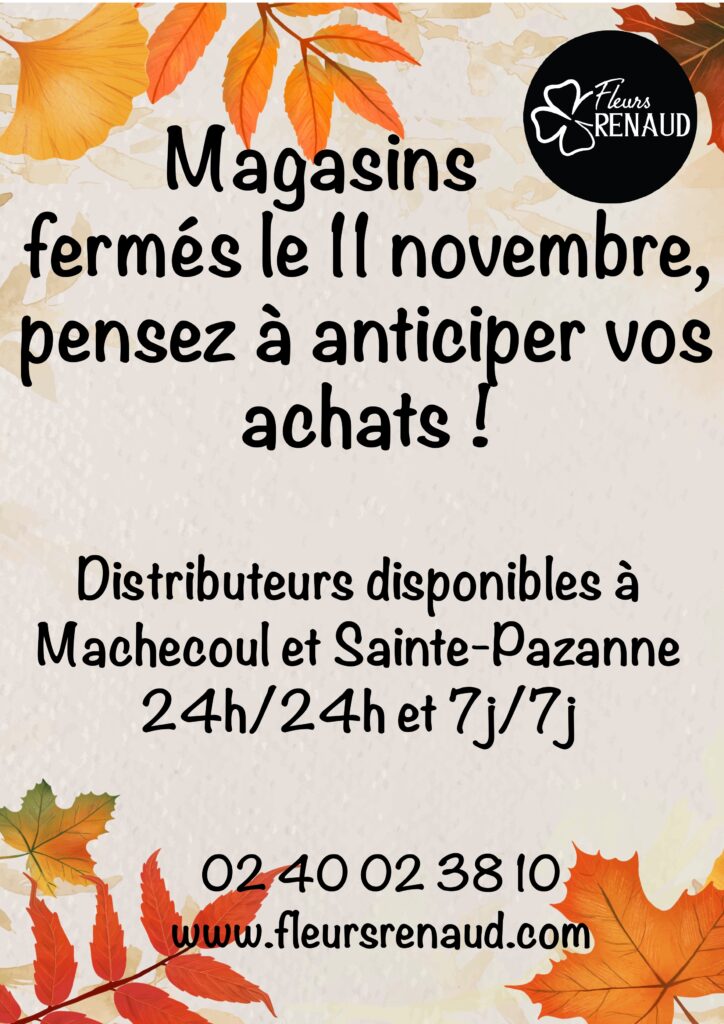 Nos magasins sont fermés ce mardi 11 novembre mais nos distributeurs situés à Machecoul et Sainte-Pazanne restent accessibles 24h/24h et 7j/7j ! 🍁